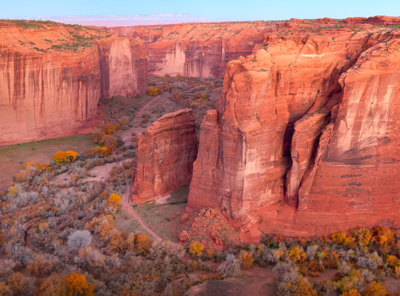 Bridalveil Creek enters the west end of Yosemite Valley from the south and takes a 620 foot plunge, as Bridalveil Fall, toward the valley floor. The valley in which the creek runs just before it reaches the brink of the waterfall is probably the classic example of a glacial hanging valley in the entire world: a strongly U-shaped valley intersecting another U-shaped valley with a large drop in altitude. This is the waterfall which adorns the familiar views of Yosemite Valley from Inspiration Point. Several January days in a row, with daytime temperatures in the shade never exceeding 30 degrees, resulted in the buildup of this considerable coat of ice. It was just beginning to peel off in great sheets, when I returned for this second and final attempt at the image.