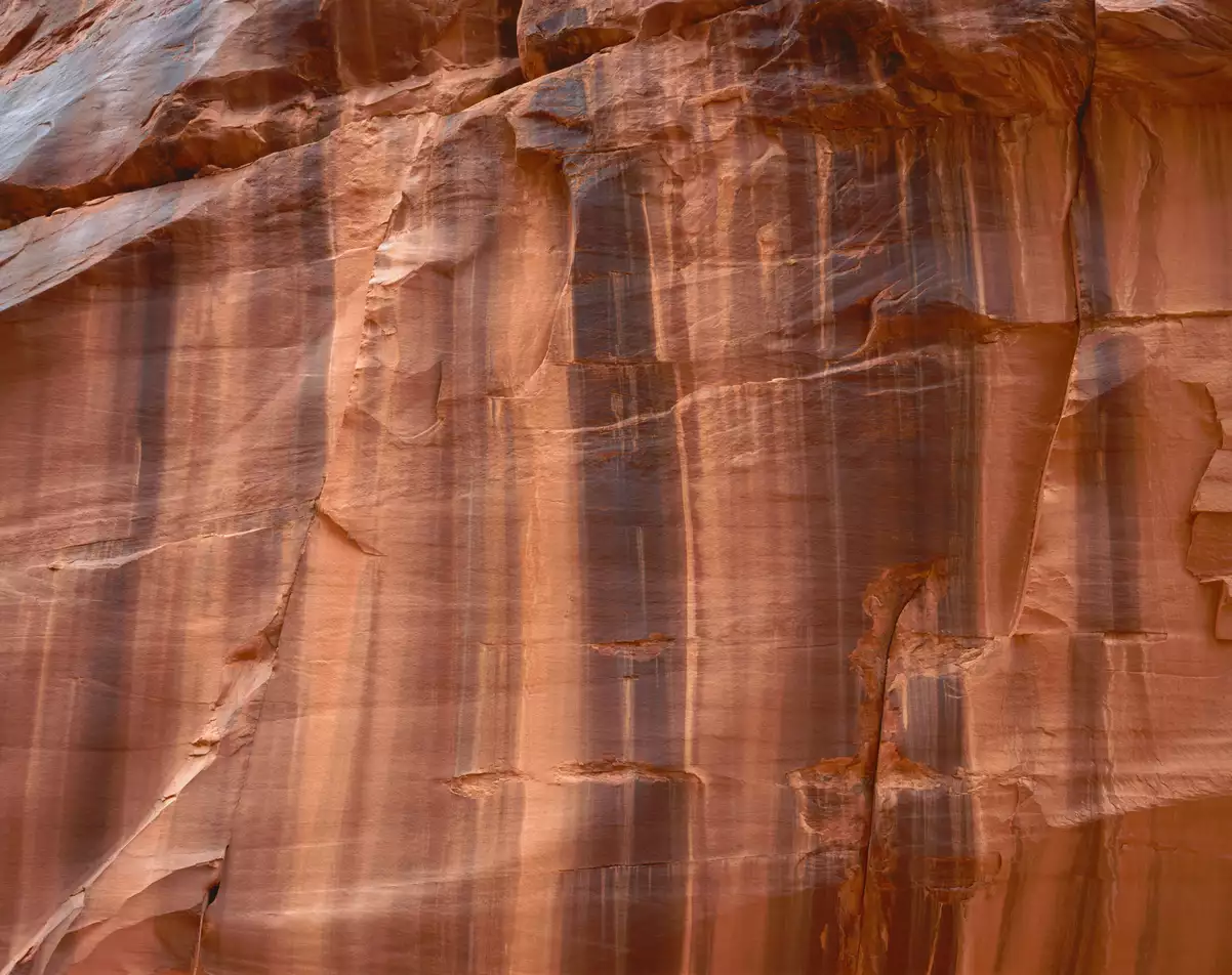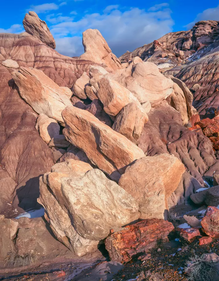 Monument Valley is a Navajo Tribal Park. Many families live simple lives there as shepherds, campground and visitor center operators, or tour guides. The wealth of their setting is, however, considerable. The visual power of the place can be well judged by the huge number of commercial film and photography projects which employ it as a backdrop for their various products, fortunately, with remuneration to the tribe. It was also used a lot for old Westerns and in a sense may be regarded as the classic Western landscape. Twenty-four hours earlier, I failed to render the same scene, completely blanketed in white. It was dusk and the view was north and east. Sadly, someone of highly questionable character has since carved his name (illegibly) in these boulders, probably the most famous and sacred in America, save Plymouth Rock. —from Natural Light, published in 1990