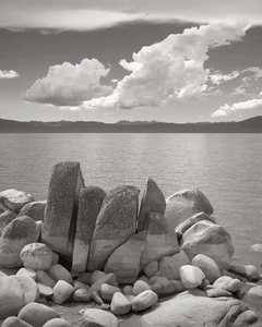 The top of the tallest rock is between 20 and 21 feet above the water's height and the high water mark is about 8 feet above it. The rocks are bigger than they look. There was a mild thunderstorm overhead. I was very pleased to be able to make both great B&W and color versions of this scene, which is unusual. I've always loved Ansel's Thundercloud, Lake Tahoe, so it was especially gratifying to make a picture that I like even better.