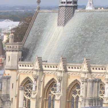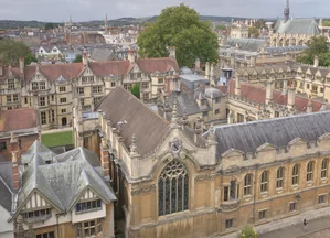 This is a view from the east of the same college pictured from the south in image #555 Brazenose College, Oxford, England 2018. The view is to the WNW, with the River Thames about a thousand yards in the distance, beyond most of town. The woman in the lower right it using her smart phone to make a picture of the most famous building in Oxford, the Radcliffe Camera. The chapel in the upper right and the buildings just in front of it are parts of Exeter College, the fourth oldest among the currently 39 colleges of Oxford University, the college founded in 1314. The spire at the left is atop a building of Nuffield College and the second one from the left is that of the Wesley Memorial Methodist Church. Finally the two spires visible in the distance just to the right of the steeple of the Exeter College chapel are each features of Balliol College, founded in approximately 1263.