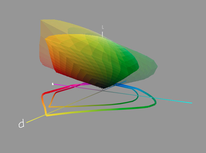 The following nine movies of eight 3D gamut comparisons are available as zipped, QuickTime movies by clicking the links below. They will download to your hard drive and should play automatically in QuickTime Player (I hope and expect they will work on Windows too, so long as you have Apple's free player). Please only take what you can use as the files are large. All of these comparisons are intended and carefully chosen to give meaningful comparisons with a minimal level of effect on the results from uncontrolled or irrelevant variables, however, so many things can affect gamut volumes that any such comparison must at least be seen as something which is unlikely to be entirely repeatable.