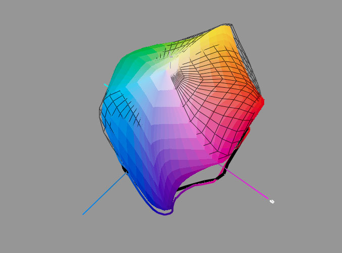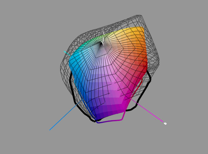 Here are two gamut views which compare the UltraChrome K3 inkset, with the new UltraChrome K3 Vivid Magenta inkset. The wireframe is the newer result.