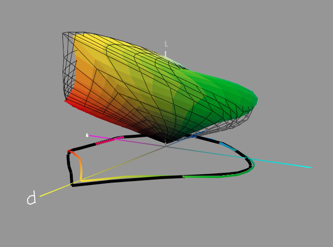 Another thing which is important to try to understand while looking at gamut models is basically which color is which. Some colors appear in photographs much more often than others and are therefore more crucial to be able to print. My own experience, which is largely dominated by landscape photography, but also by the design of RGB working spaces for digital capture, during which I carefully and systematically took artificial colors into account as well, has shown that the more critical color ranges for having relatively high gamut include the yellow to red range, and the sky blue range, whereas the pure green to cyan and the magenta to pure (royal) blue range are less important. In light of these observations, the latest Epson system color gamut (inkset plus photo-style paper plus dot placement) is particularly strong, well beyond what the indicated gamut volumes alone would suggest.