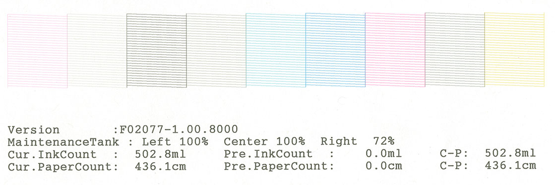 12) Another innovation of the 11880 is that head cleaning can now be carried out in five separate sub-groups! In other words, instead of having to waste ink to clean all the nozzles when just one color shows a clog, you can now select, from from one of five choices on the LCD on the 11880: Menu > Maintenance > Clean Each Color: C/VM, PK, MK/Y, LLK/LK, or VLM/LC! Yay! At this point, the Mac driver, shows no evidence of implementing this feature from the computer. Note that I prefer to do my nozzle checks on 8.5 x 11" sheets of plain laser paper, inserted vertically. I check the yellow with a Schneider 4X loupe so I can see it well enough. The nozzle check pattern from the 11880 is mindblowing for the huge number of nozzles in the pattern. It's quite a departure from what we're used to seeing. Here it is: