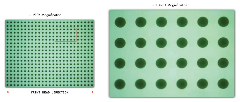 And here is the amazing dot quality image -- incredible roundness (for dots of this tiny size -- see below), incredible consistency of size and shape from dot to dot, and incredibly repeatable location -- a nearly flawless grid of columns and rows is achieved. Not to mention the total absence of satellites! Note that the spacing between the rows and columns in the image at left may have been degraded a bit by inadvertent scaling in the PDF or earlier -- some row spacing variability is visible at left which I don't see in the more zoomed-in section. It is possible, however, that this group of dots was printed without paper movement being a part of the result, i.e. in a single pass. Still, TFP head's printing regularity is amazing. I saw dots this round from the very early Epson printers (mid-1990's) on polyester-base print material, but they were far larger and were applied far more slowly. After that, dot regularity and shape has deteriorated as the prints speeds went up and the dot sizes shrank, but it looks as though we now have the best of speed, size and regularity all at once.