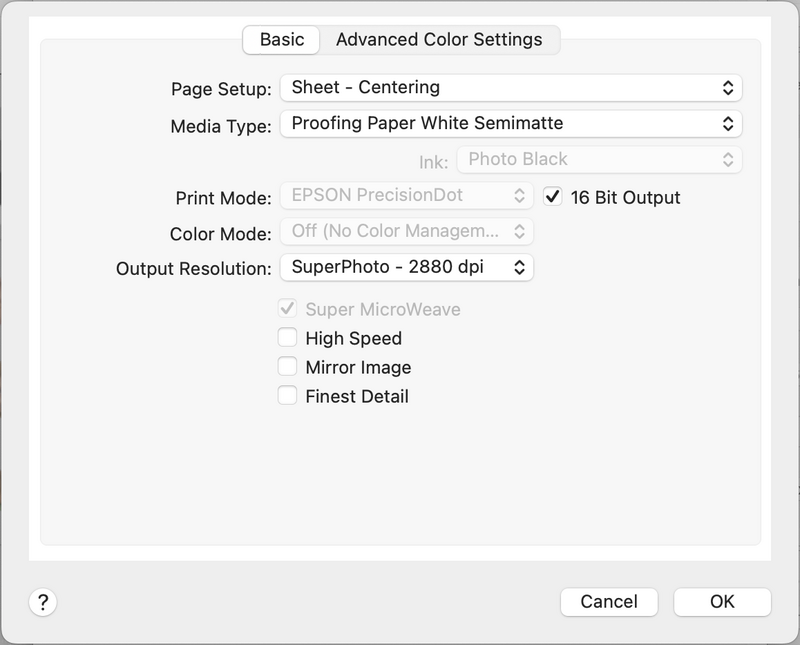 Here is the Printer Options > Printer Settings dialogue for an EPSON SureColor P9000 Standard Edition in my preferred configuration for running certain color management debugging tests of late. When my printer’s built-in Default Settings are loaded, either intentionally or because a bad preset is used or because the “Cancel” bug occurs, just about everything here changes, so it’s obvious when I look back into the dialog after just having left it by hitting Cancel or OK.