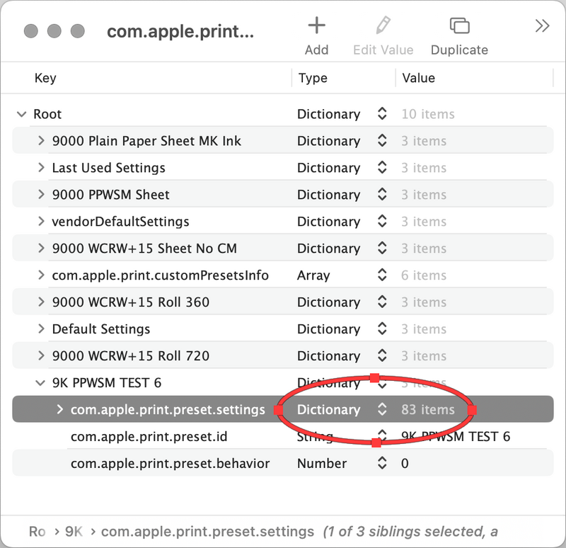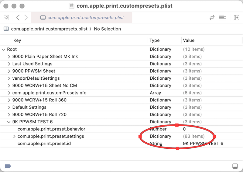 That line also contains the word “dictionary” and a number “(XX items)”. If that number is in the range of 80-something to 90-something, your preset is a good one, i.e. a complete “print job” one, at least in the case of an EPSON wide format printer. If the number is something like 6 or 10 or perhaps even 30, it’s a bad one. But double-check with your printer that this appears to make sense. I don’t know how many settings are stored in a full preset for Canon, HP or other printers. Some kinds of printers likely have greatly abbreviated full sets of settings but this is only a matter for printers for which you’ve actually saved one or more presets. Look for any preset you suspect may be bad and compare the number with one you suspect is good. Once you know the approximate number of items to show up in that one line of a saved preset for your printer, you should be all set to verify the integrity of your presets super easily.