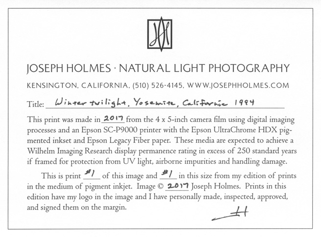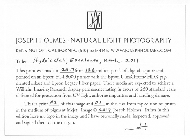 The upper one is a sample of a typical, current design for images which were captured on film. The lower is a sample for an image captured digitally. Once the WIR test results for this medium are published, my actual certificates will be updated with the results of those tests, though I am not likely to replace the images here anytime soon. The self-adhesive certificates themselves are made entirely with high-stability ingredients. In most cases, each print is supplied with two of them. The first is like the ones above and is for the back of the mount. The second is marked as a duplicate for use after framing, because framing very often covers up the back of the print and thus the provenance would otherwise be lost.