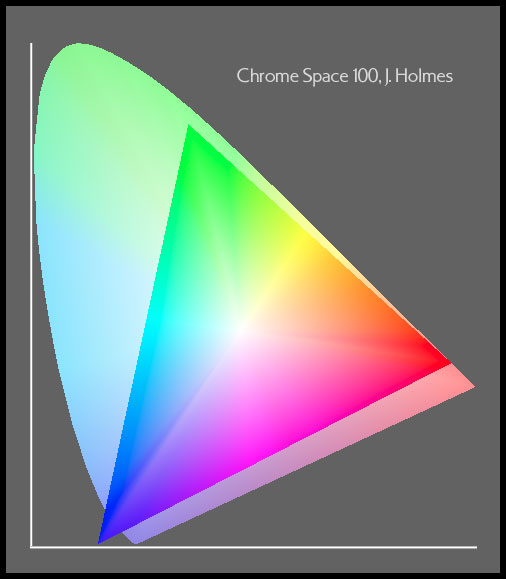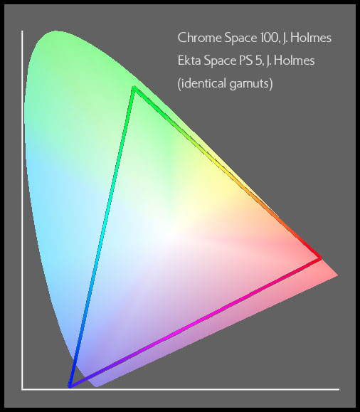 8) Chrome Space 100, J Holmes: this is an overhauled version of my first working space, Ektachrome Space, J Holmes and replaces it, as of mid-2005. Chrome Space 100 is backward compatible with the original space and cleans up a few technical issues that I was unable to address when I first created my master archiving space for scanned film. I have used Ektachrome Space for all my scanning from 1997 through 2005, and Chrome Space 100 from then on. The newer version can be assigned to files scanned into the older version with essentially no visible change. The gamuts and white points of Chrome Space 100 and its sister space Ekta Space PS 5, J Holmes (aka Ekta Space) are identical. Only the tone curves are different. Chrome Space 100 uses a custom 1,024-point tone curve very carefully designed to match the tonality of perceptually linear printers. This curve is shared by my DCam spaces. Ekta Space instead uses a simple Gamma 2.2 curve, as do Adobe RGB and some other spaces (most working spaces use gamma curves). Gamma curves are too flat near black. I built Ekta Space because Adobe® Photoshop® 5 did not support RGB spaces unless they had simple gamma curves, but Ekta Space went on to become the more commonly used of the two because I gave it away from the beginning. My transparency spaces were conceived around the actual gamut of the dyes in transparency films, as mapped by a proper scanner profile, so they are most appropriate for use with scans of positive films, however as a practical matter they work well with scans of color negatives and fairly well with digital camera captures, though weak on the yellow side.