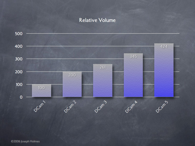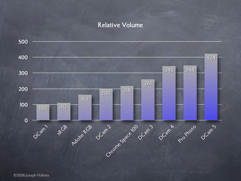 5) DCam 5, J Holmes set: The fifth and largest of my five new spaces specifically for digital capture, DCam 5 is useful as a special-purpose, extremely large gamut space for digital camera captures and other RGB imaging work. It has a gamut volume and shape just sufficient to perfectly encompass the entire human visual gamut. Like most of my spaces it uses my proprietary tone curve for optimal perceptual linearity. The net, Lab-constricted gamut volume of this space is 324% larger than DCam 1, 278% larger than sRGB, 161% bigger than Adobe RGB, 112% larger than DCam 2, 95% bigger than Chrome Space 100, 63% bigger than DCam 3, and 25% bigger than DCam 4. Its non-Lab-constricted gamut is about 8% larger still. This space, like DCam 4 and ProPhoto, should generally only be employed with 16-bit per channel image data, given its great size. DCam 5 provides a lot more headroom than DCam 4, though this range of added headroom is sparsely populated by typical image colors, so under most circumstances it should not be particularly useful. It may prove useful, however, as a space into which to do batch RAW conversion, so as to defer the handling of clipping issues until later on. After years of looking at the way RGB spaces are limited in their ability to cover the CIE chromaticity diagram's visual gamut range by the inability of the blue coordinate to be placed below the x-axis, I just decided that I wanted to make such a profile, and the exact coordinates necessary to just fully encompass the visual gamut were the most obvious and appealing design for such a giant space. Perhaps others will find uses for it which have not occurred to me. It is available without chroma variants as part of the Eight Master Spaces set, which goes for $30.